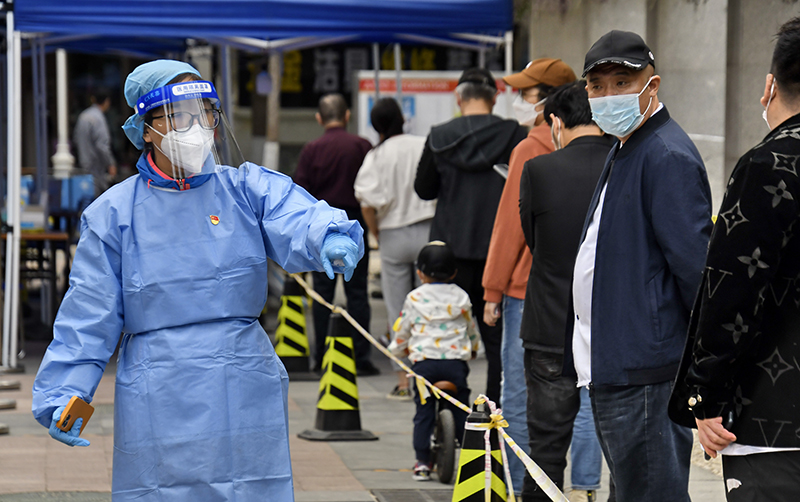 共产党员、北京八里庄街道机关干部张茜(左)在核酸筛查现场进行秩序维护(2022年5月11日摄)。新华社记者 李欣 摄