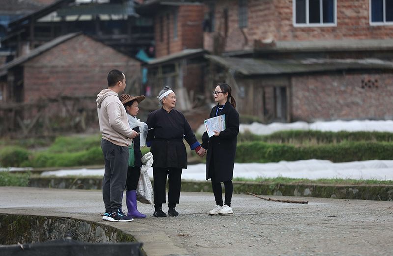在广西柳州市三江侗族自治县良口乡南寨村,纪检监察干部(右一、左一)在了解惠农政策落实情况(2022年3月24日摄)。新华社记者 黄孝邦 摄