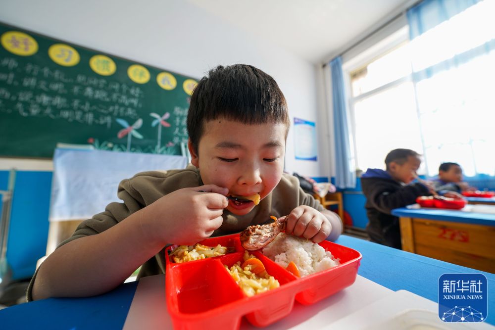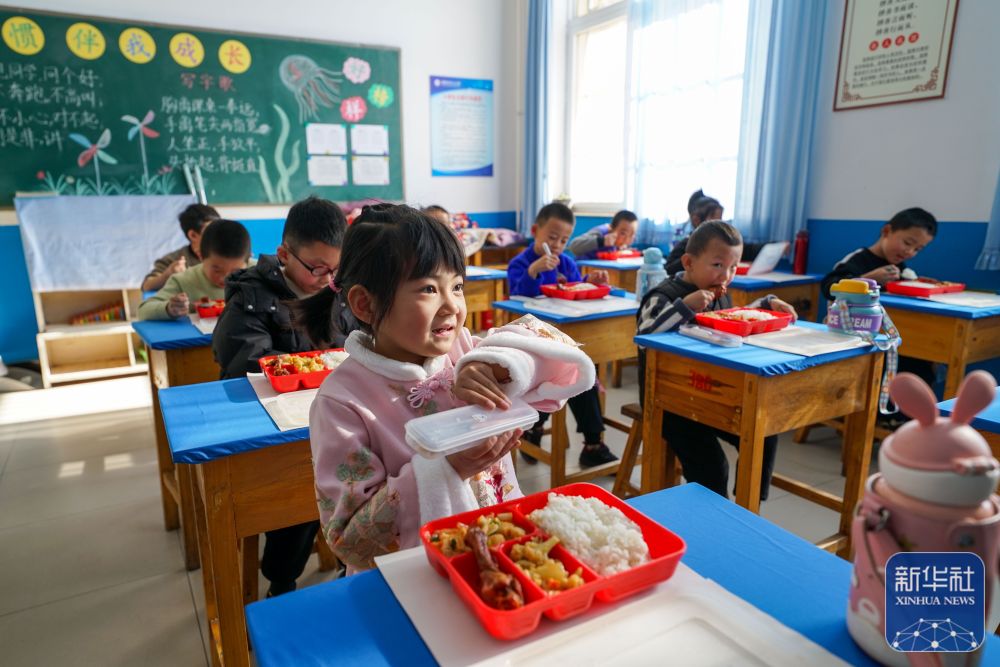 12月5日,在乐亭县胡家坨镇中心小学,学生在教室内吃午餐。