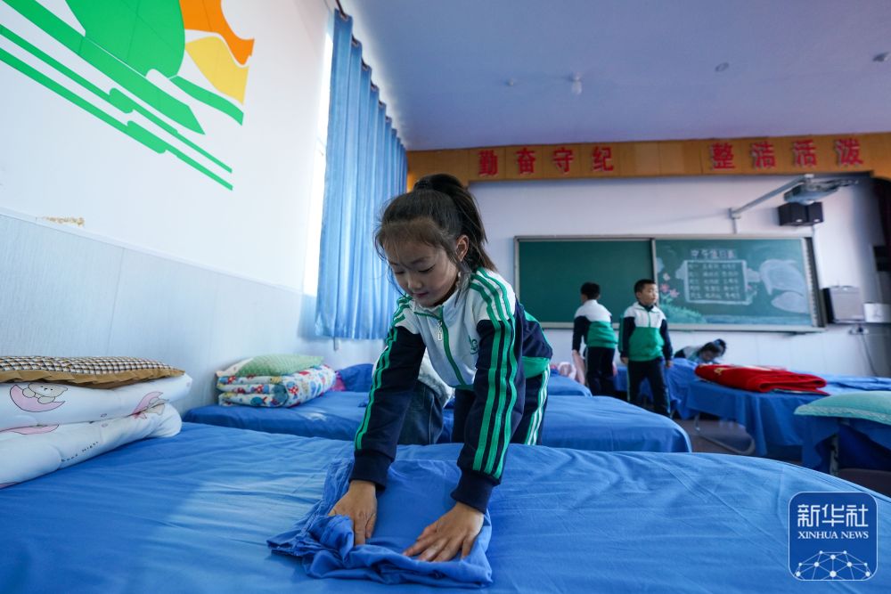 12月5日,在乐亭县姜各庄中心小学,学生在午休完后整理床铺。
