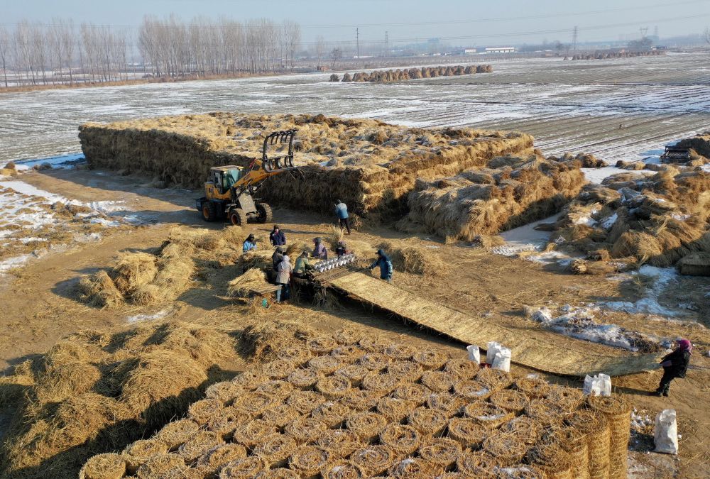 ↑ 1月12日,河北省唐山市丰南区西葛镇一家有机水稻种植合作社的社员用回收的稻草编制草帘(无人机照片)。