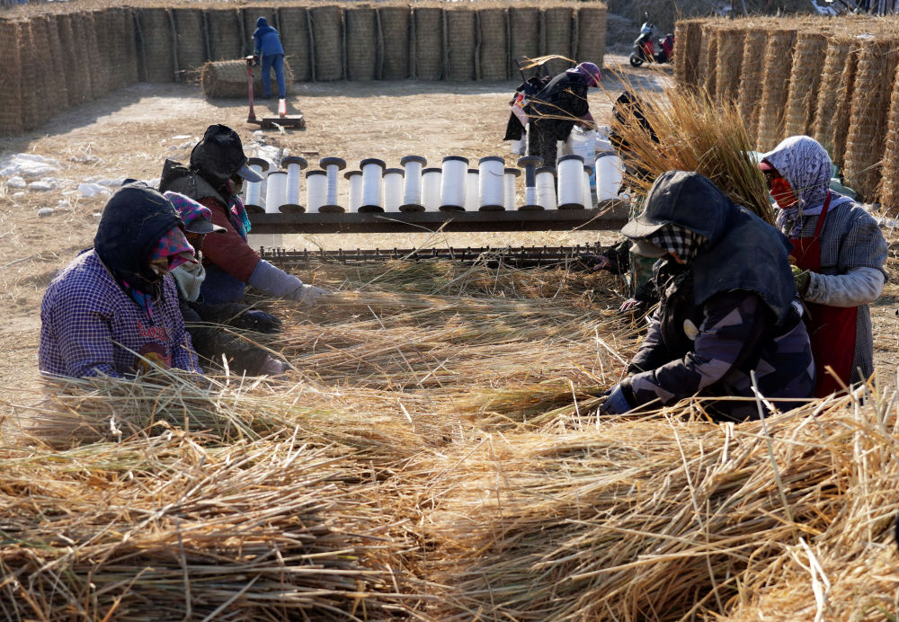 ↑ 1月12日,河北省唐山市丰南区西葛镇一家有机水稻种植合作社的社员用回收的稻草编制草帘。